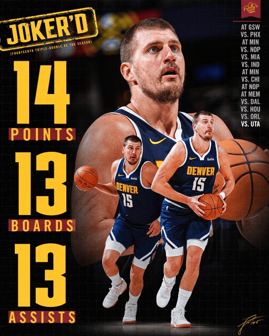 賽后,掘金官方發布約基奇數據海報,全場得到14分13籃板13助攻。